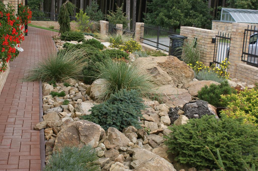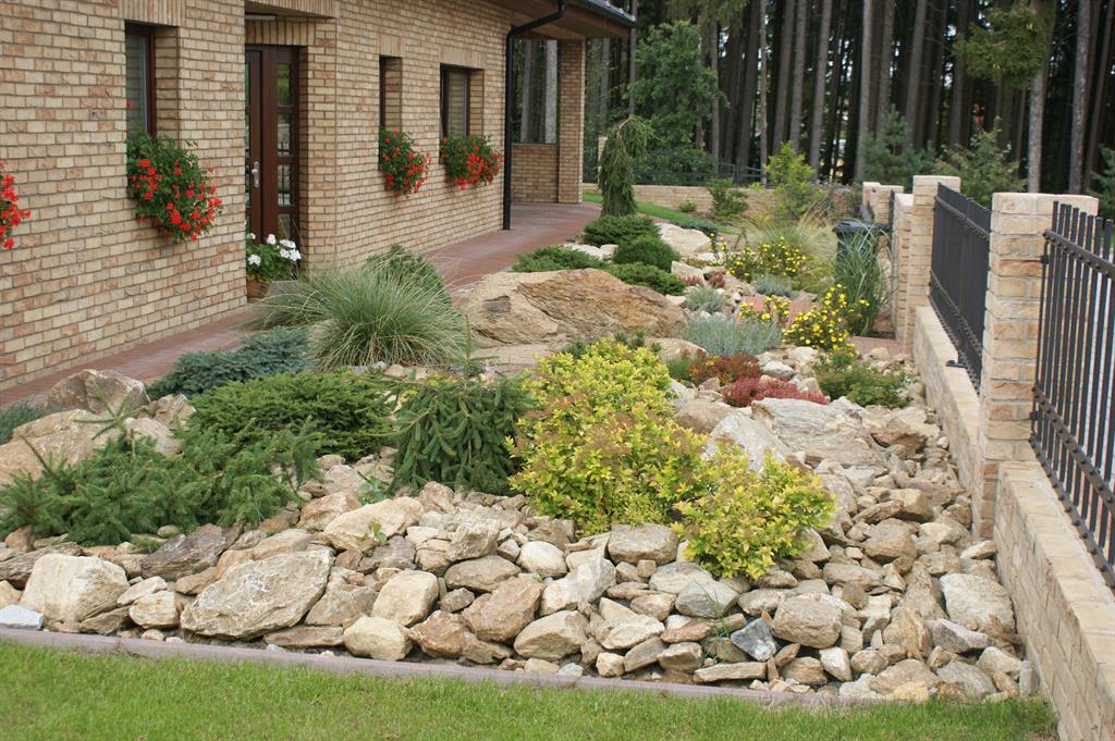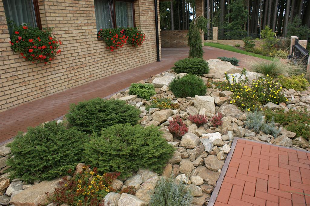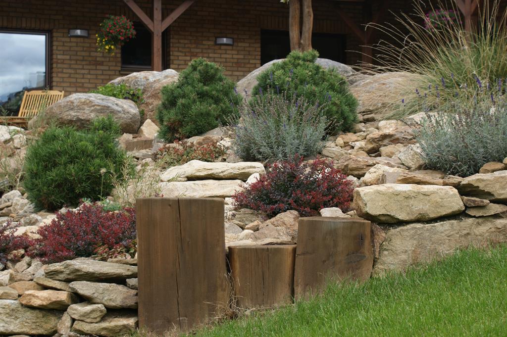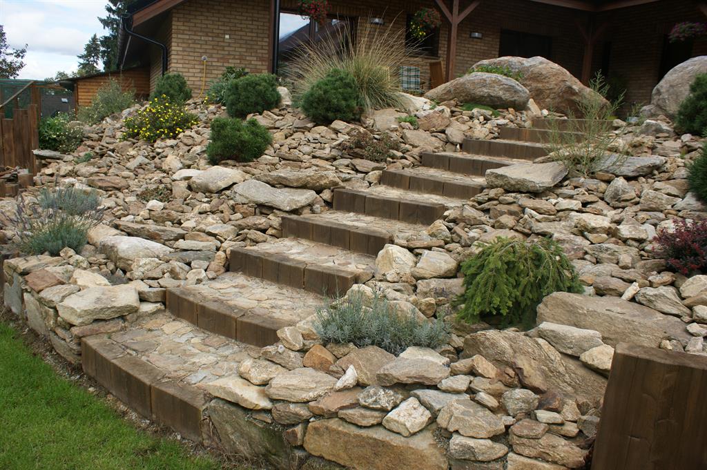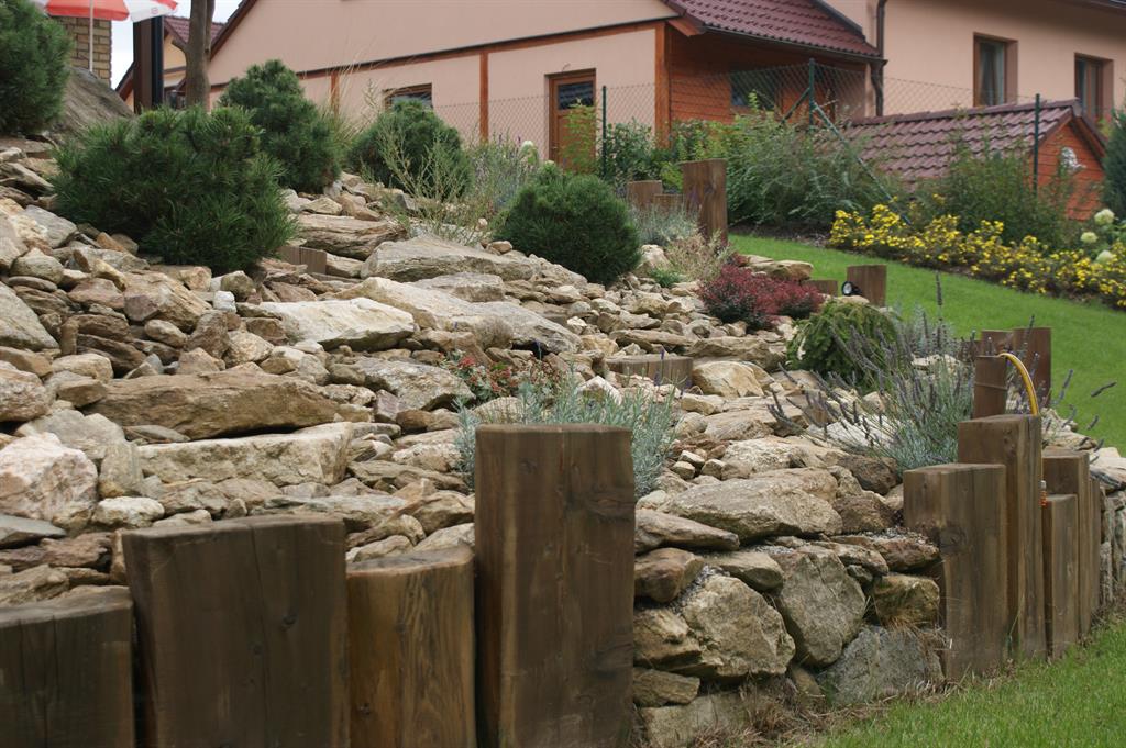 Kamenná zahrada u rodinného domu v Jihlavě, kombinace kamene a modřínové dřevěné prvky.