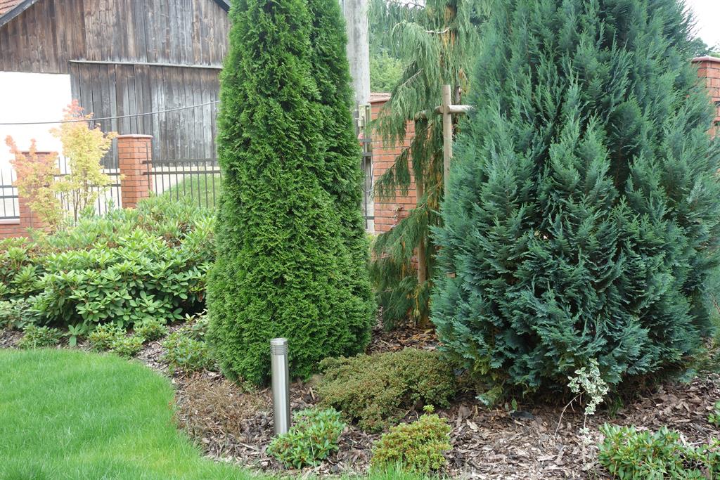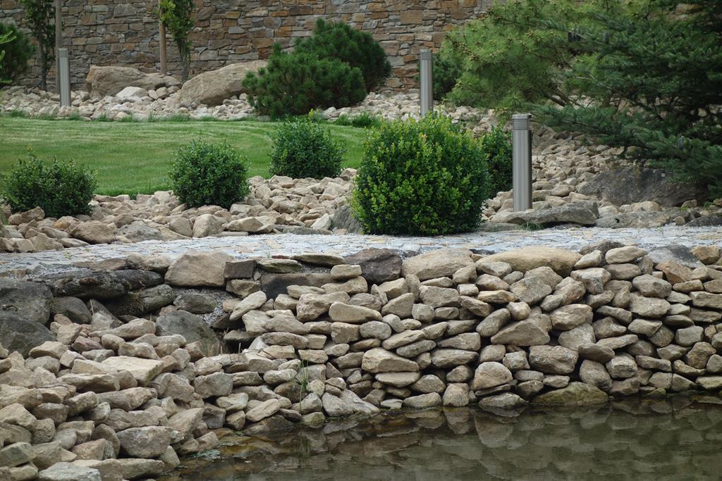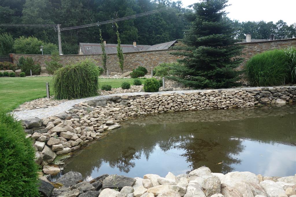 Realizace soukromé zahrady s osvětlením a jezírkem na klíč. Výsadby jehličňanů.