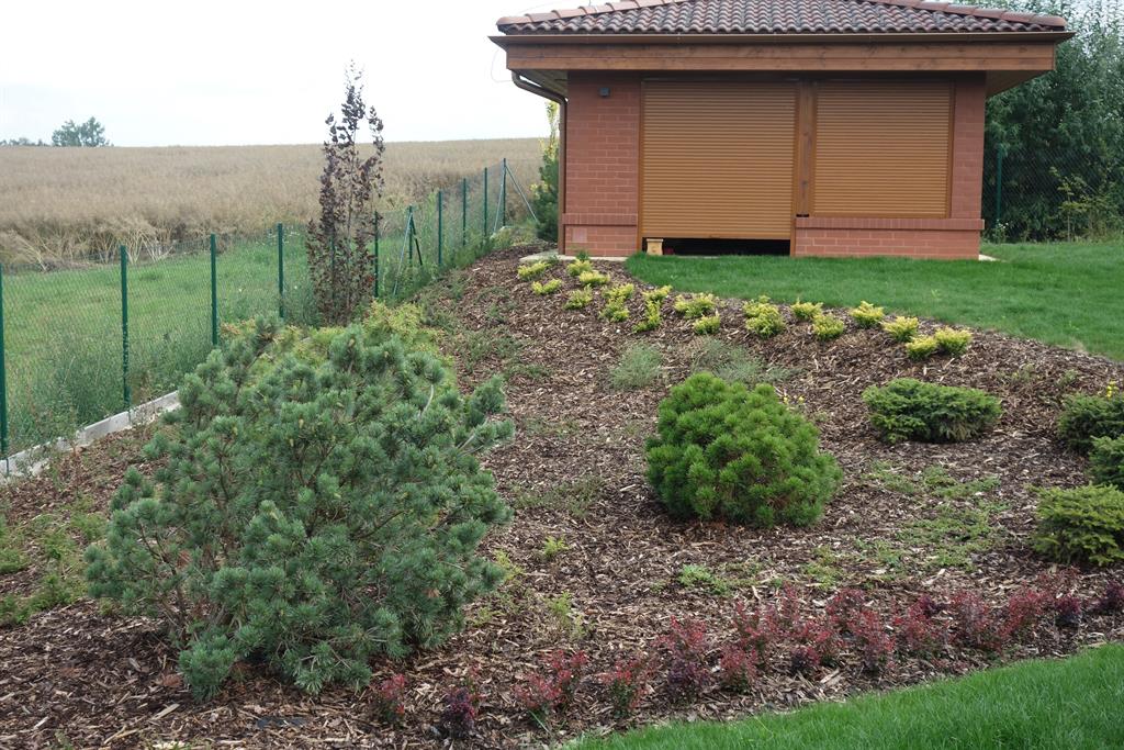Návrh a realizace soukromé zahrady v Hosově. Terénní úpravy, výsadba dřevin, založení nového trávníku.