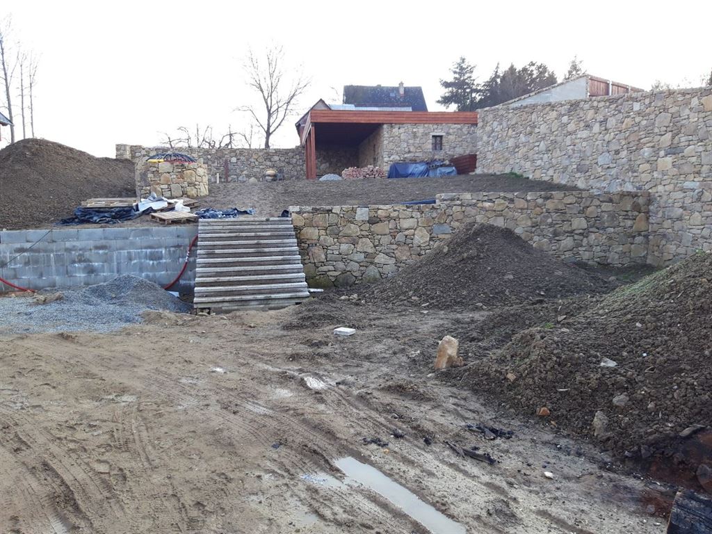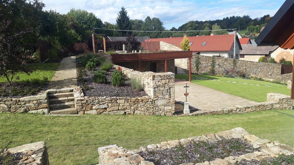 V rámci projektu jsme realizovali náročné stavební a kamenické práce, které zahrnovaly výstavbu opěrných zdí, kamenných obrubníků, schodišť a dalších architektonických prvků. Tyto konstrukce nejen funkčně řeší terénní nerovnosti, ale také dodávají zahradě charakter a strukturu.
