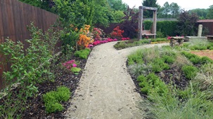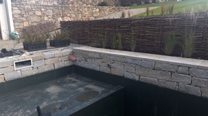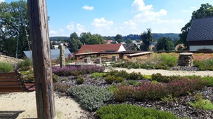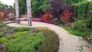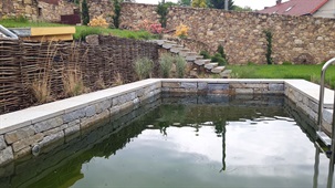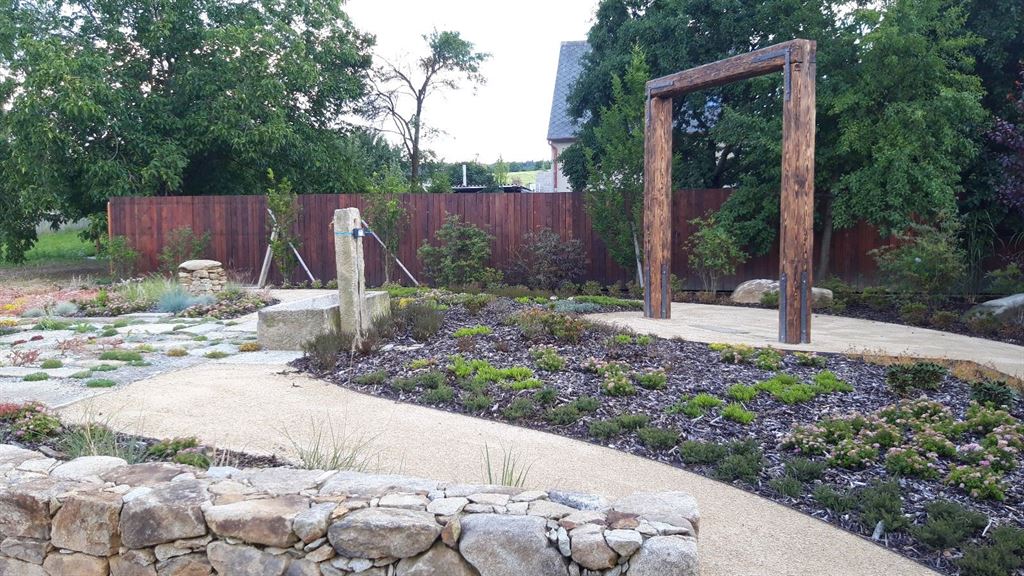 Realizace zahrady na klíč, koupací jezírko, zpevněné mlatové cesty, výsadba zeleně