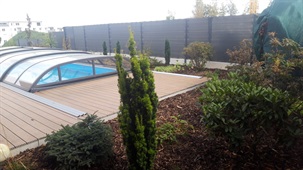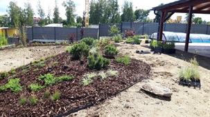 Výsadba keřů a květin v části zahrady s krytým bazénem