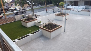 Nedílnou součástí realizace bylo osázení velkého množství betonových vyvýšených záhonů. Tyto moderní prvky jsme osadili pečlivě vybranými rostlinami, které celému rezidenčnímu areálu dodávají reprezentativní a současně přívětivý charakter. Vyvýšené záhony plní jak estetickou, tak praktickou funkci – strukturují prostor, oddělují jednotlivé zóny a usnadňují údržbu zeleně.