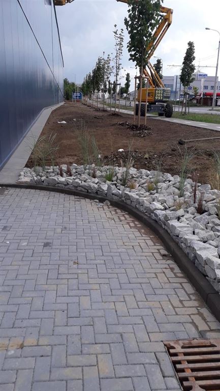 Podle našeho návrhu výsadby, travin a stromů jsme provedli výsadbu zdravých vzrostlých stromy, které budou dlouhodobě zkrášlovat okolí prodejny a poskytovat přirozený stín. Výběr dřevin byl pečlivě přizpůsoben místním klimatickým podmínkám a charakteru tohoto komerčního prostoru.