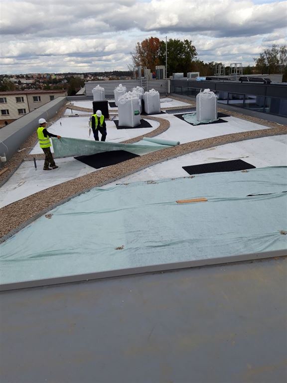 Součástí realizace zelené střechy bylo odborné posouzení sklonu a nosnosti střechy a návrh vhodného skladby rostlin a materiálů do zelené střechy. Následně jsme provedli přípravu podkladu, výsadbu rostlin na střechu a realizaci vegetačního souvrství, které splňuje požadavky na bezpečný provoz zelené střechy, správné hospodaření s vodou a dlouhodobou stabilitu zeleného porostu střešní zahradě.